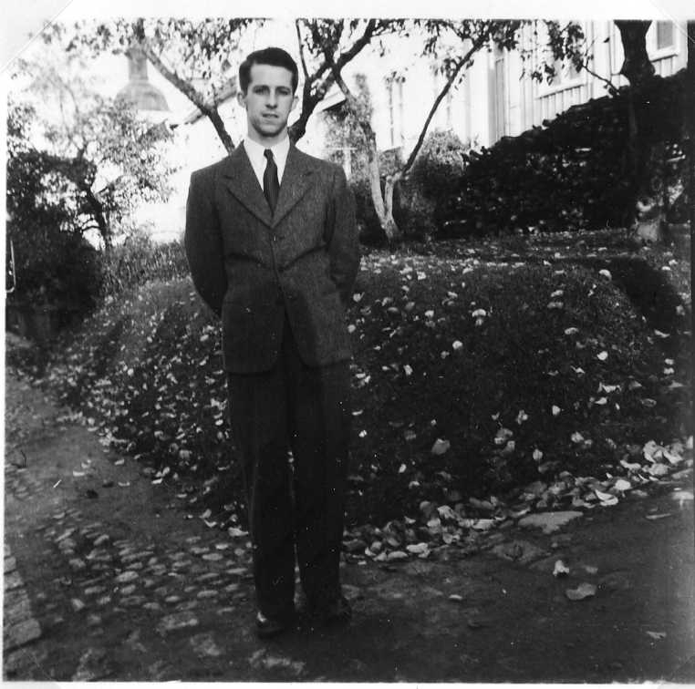 En man i kostym och slips med händer bakom ryggen står vid en tvärgränd till Brahegatan i Gränna.