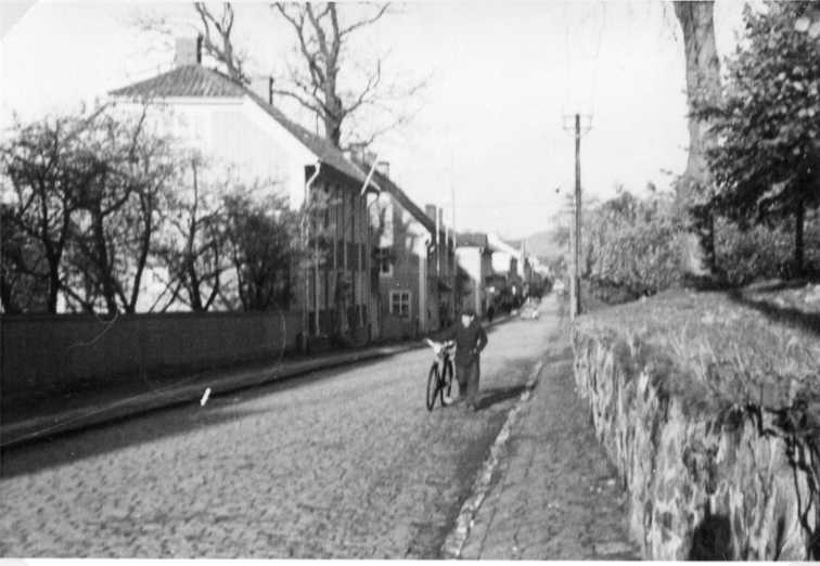 En man leder en cykel på Brahegatans östra sida söderut. Han går nedanför kyrkan med prästgården till vänster.