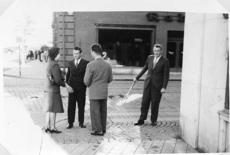 Tre män i kostym, en med ett tennisrack i handen, står vid en gatukorsning och talar med en kvinna i hatt.