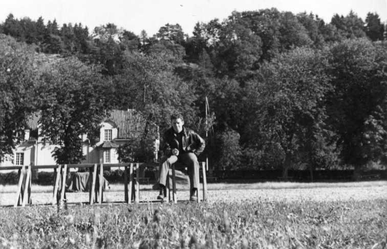 En man i skinnjacka sitter på en bock på Gränna torg. I bakgrunden syns Borgmästargården.