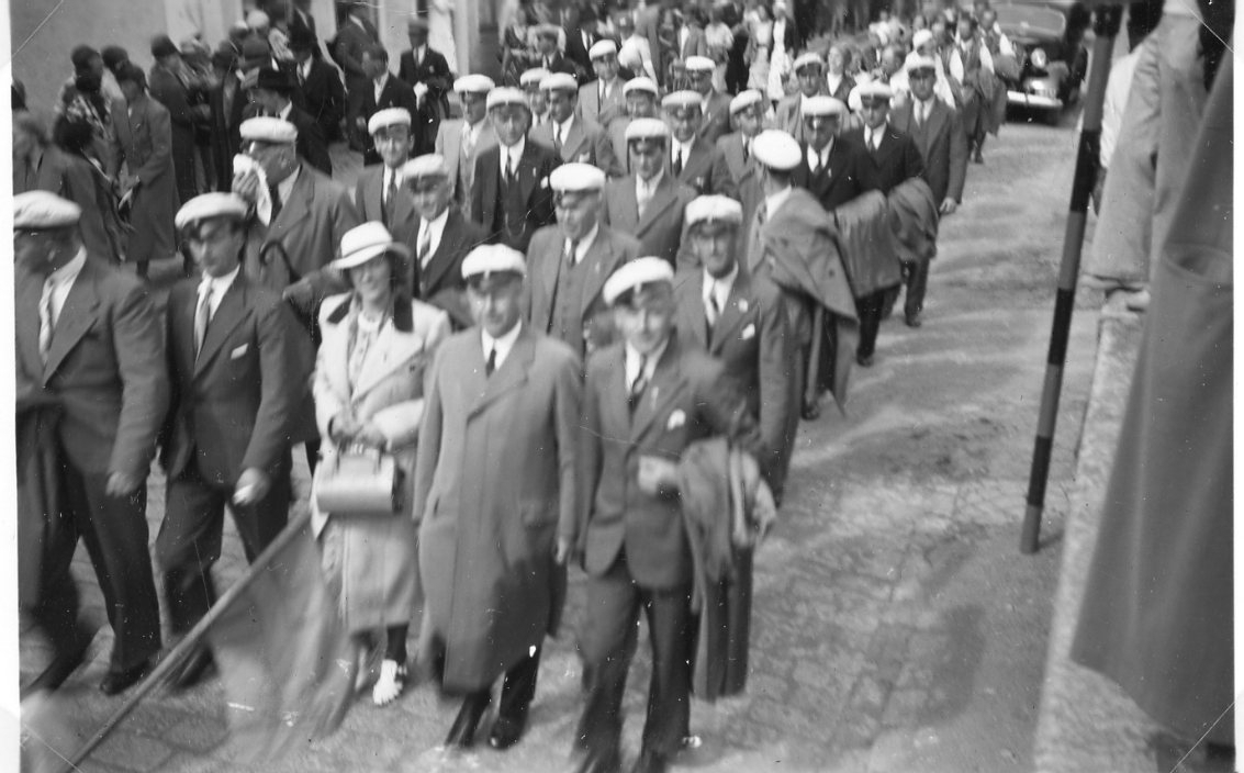 Män med studentmössa, någon enstaka kvinna, marscherar söderut på Brahegatan i Gränna.