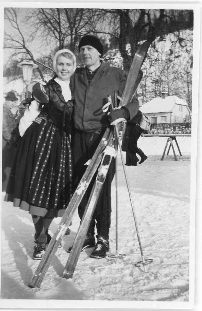 En skidåkare med skidorna i ena handen och den andra armen runt en kranskulla troligen, tillika dotter.