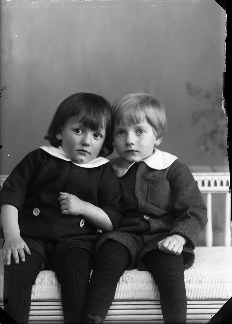 Två små barn sitter tätt intill varandra i en soffa, troligen barn till K A Larsson i Tuggarp.