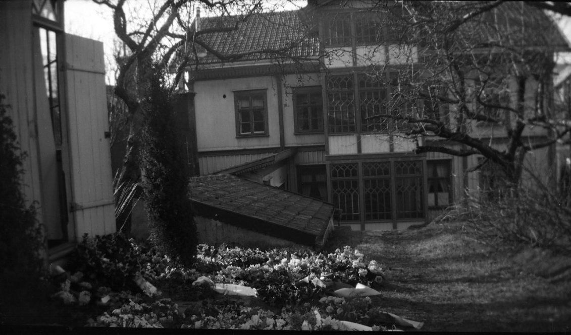 Titel: Kransband och blommor ligger utlagda på gräsmattan i en trädgård.