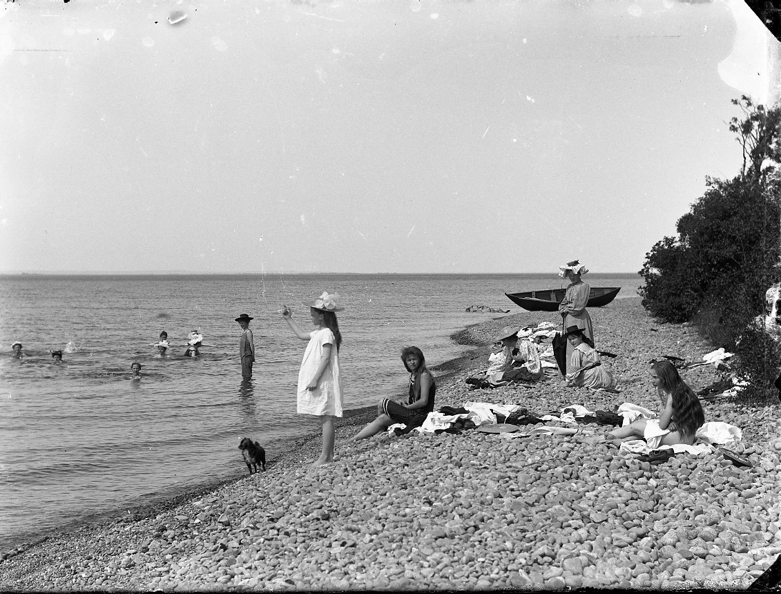 Badande flickor och kvinnor, troligen Vättern. En hund springer vid strandkanten och i bakgrunden ligger en eka uppdragen på den steniga stranden.