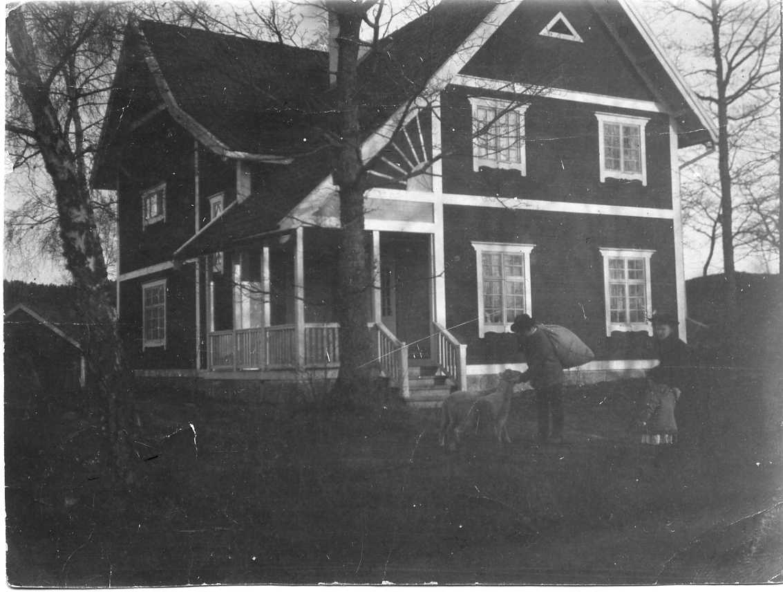 En man med en säck på ryggen står vid ett får. En kvinna och en liten flicka står bakom mannen. De befinner sig vid sitt hus.