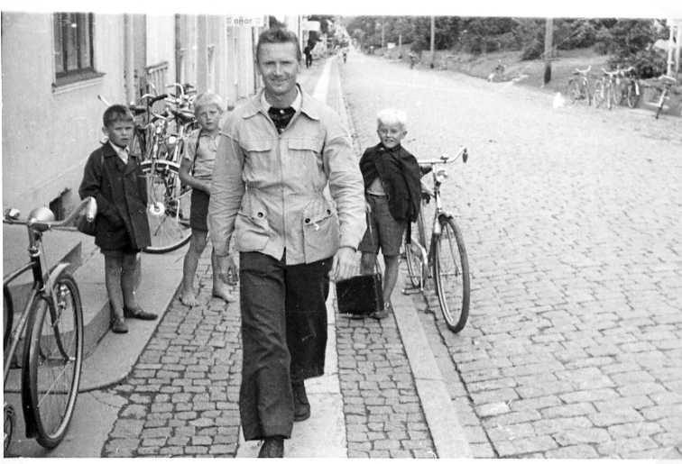 En ung man vandrar Brahegatan söderut. Tre små pojkar vänder sig om och tittar efter honom. Vid trottoaren och utmed husväggen står fler cyklar parkerade.