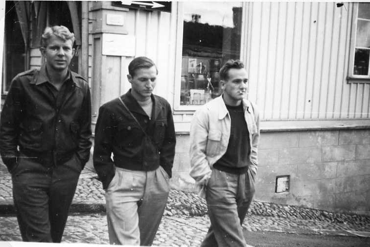 Tre unga män, L T Sanford till vänster, passerar över Ribbagårdsgränd upp vid Brahegatan. I bakgrunden syns Brahegatan 39. Mannen till höger har en cigarett i mungipan.