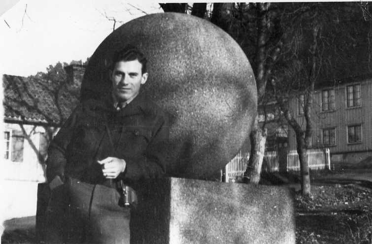 Porträtt av en ung man i flygarjacka med en kamera i rem över bröstet. Han står i avslappnad pose lutad mot tempelriddaremonumentet i Södra parken i Gränna.