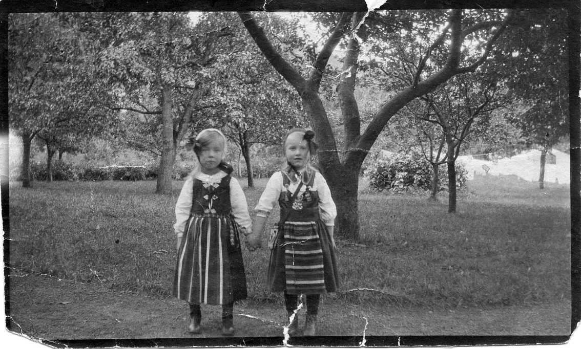 Två små flickor i folkdräkt i en trädgård. De håller varandras hand.