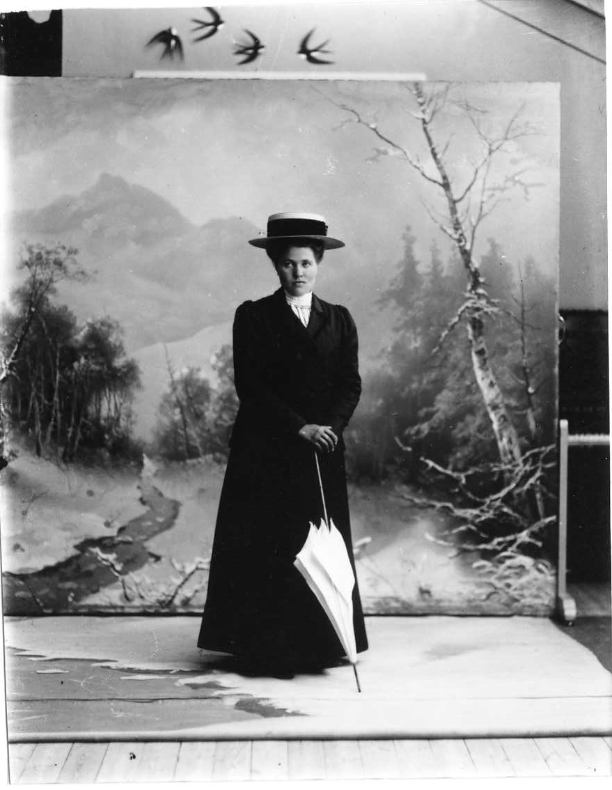 Porträtt av Anna Johansson från Fallet i Gränna socken. Hon står med ytterkläder, hatt och parasoll framför en vinterfond.