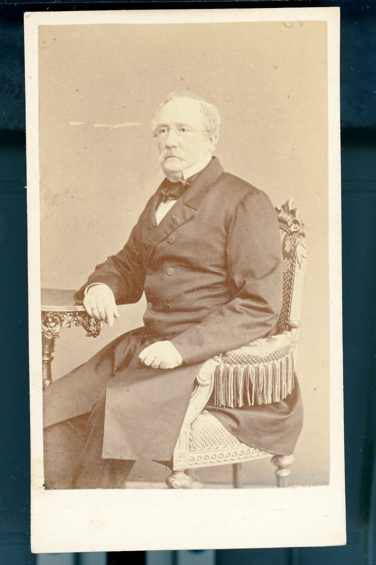 Kabinettsfotografi: Nils Fredrik Hjertström i rock och kravat sittande i en stol med högerarmen vilande på ett bord.