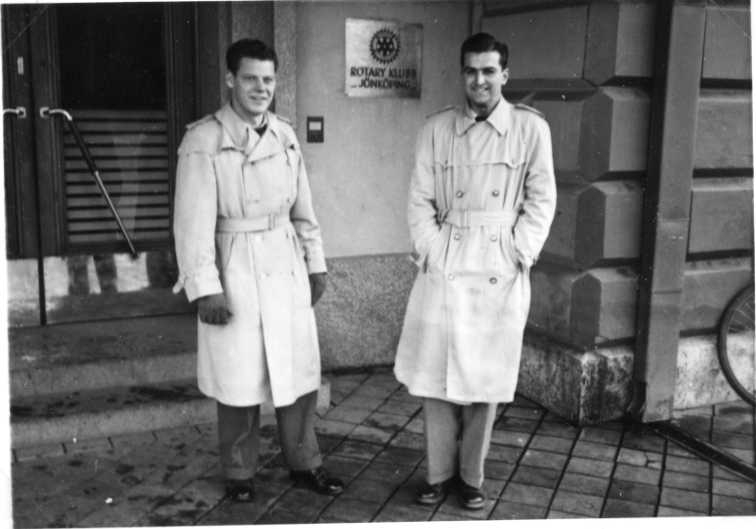 Två män i ljusa rockar framför byggnad med skylt "Rotary Klubb Jönköping". Mannen till vänster är löjtnant Ness och till höger sergeant Simi.