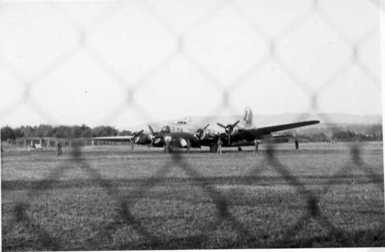Ett amerikanskt bombplan som nödlandat på Jönköpings flygplats. Sedd genom ett stängsel.