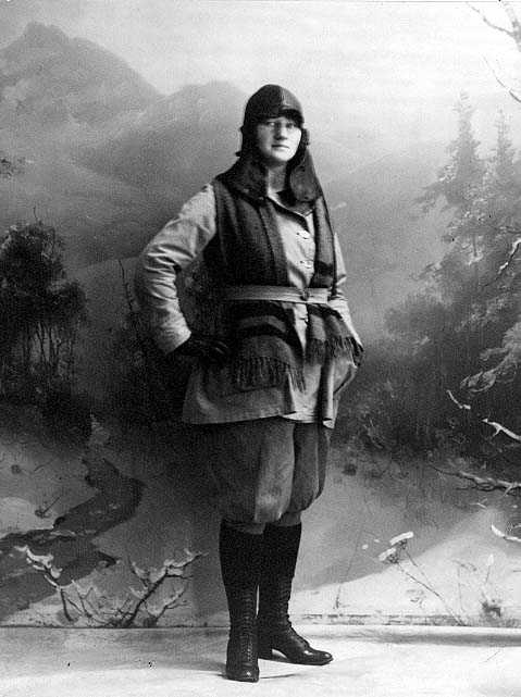 "Spätta från 1920-talet". En ung kvinna i knäkorta byxor, snörkängor med högt skaft, jacka nedanför midjan, halsduk och skinnmössa som går ner över halsen. Hon står med händers i sidorna.