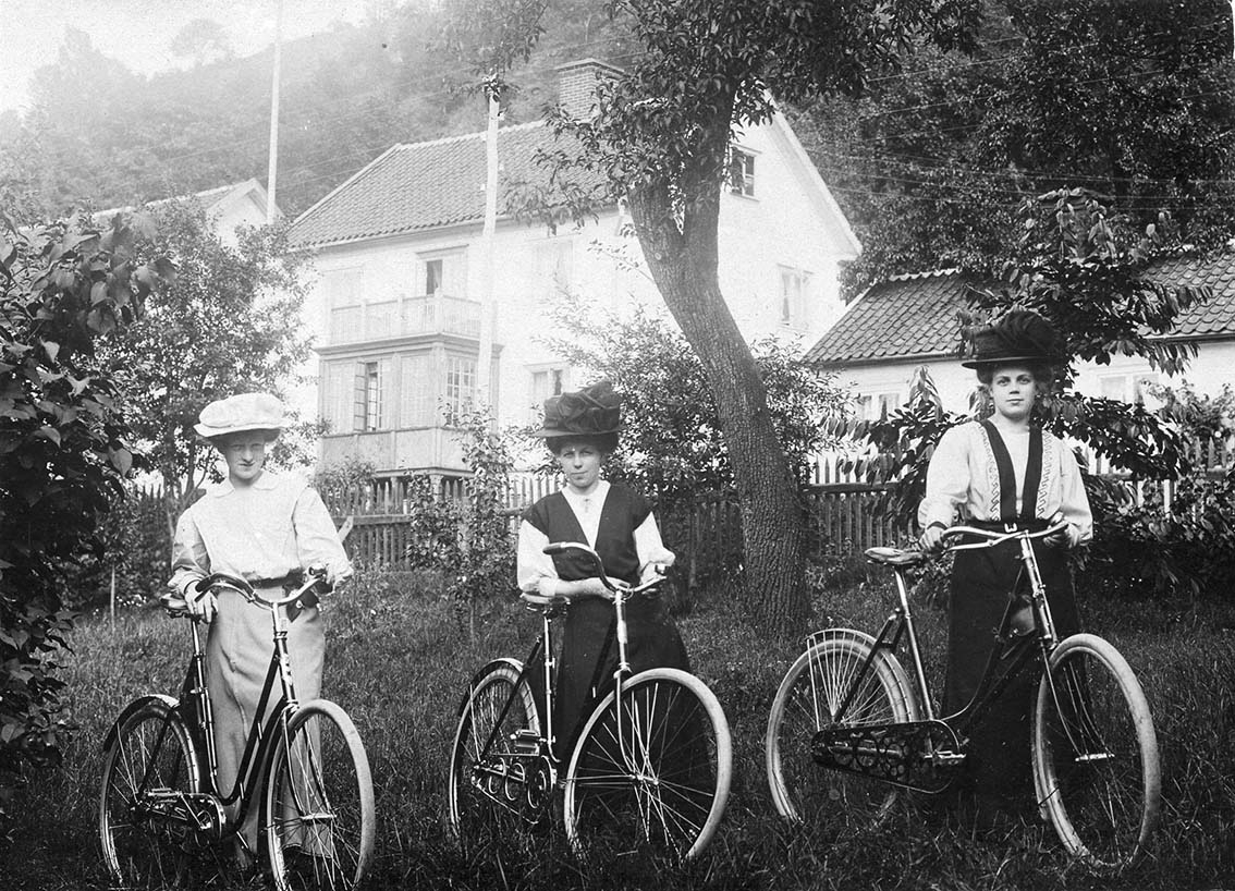 Tre unga kvinnor med stora hattar står med cyklar i en trädgård nedanför Bergsgatan i Gränna. I bakgrunden skymtar ett hus veranda och balkong.