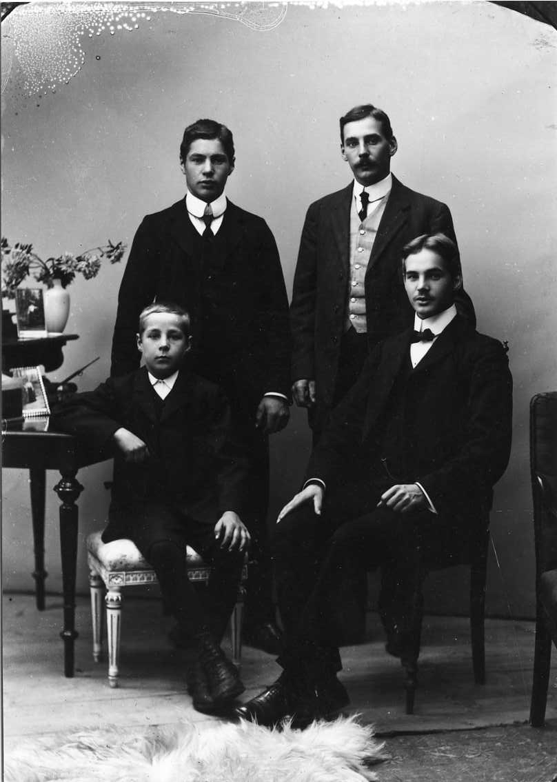 Gruppbild med bröderna Roman. Stående från vänster Carl Ture och Erik samt sittande från vänster Gösta och Ludvig. De befinner sig i en ateljé. Den yngsta, Gösta, vilar armen på ett bord med blomvas och två inramade fotografer. På golvet framför deras fötter ligger det ett skinn.