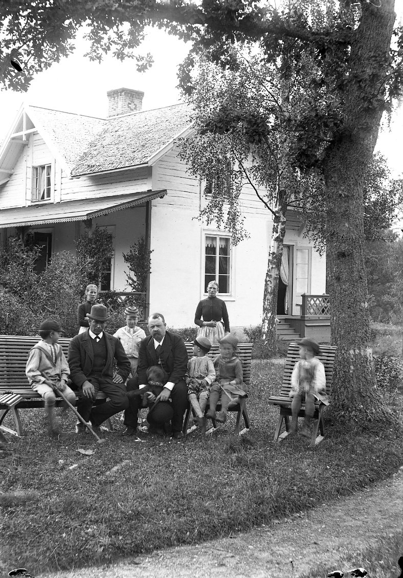 En grupp vuxna och barn, och en hund, sitter i trädgårdsmöbler framför ett tvåvåningshus med putsad nedre del. Andra våningen har liggande timmer.