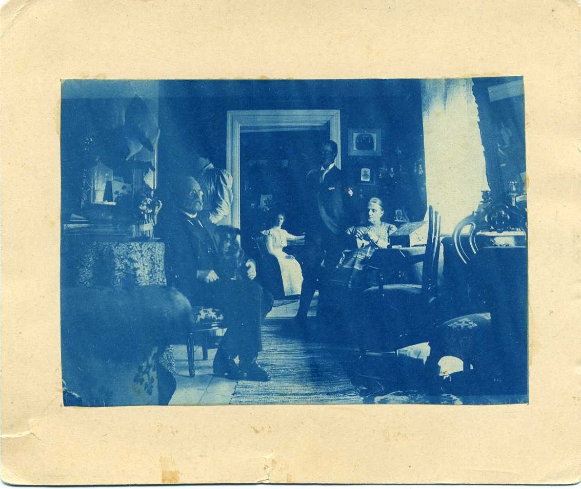 En hemmiljö. En man sitter med en hund i knät, en kvinna i ljust livstycke står i profil bakom honom. I ett hörn till höger, intill ett fönster, sitter en kvinna med sömnad. Vid dörrposten intill står en man. I ett rum längre in sitter en ung kvinna i ljus klänning. Det ligger en trasmatta på brädgolvet.