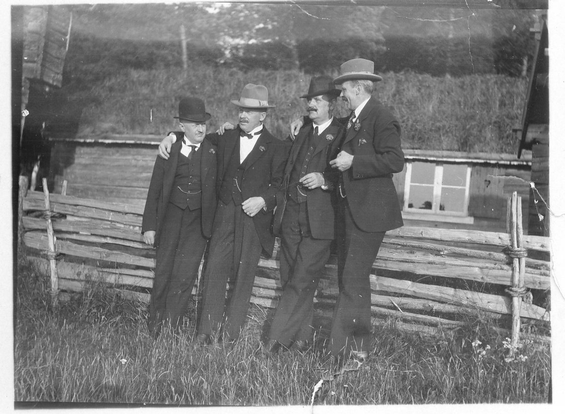 Fyra män med hattar, armarna om varandra, står lutade mot en gärdesgård som sannolikt omger pappersmakarebostället i friluftsmuseet på Grännaberget.