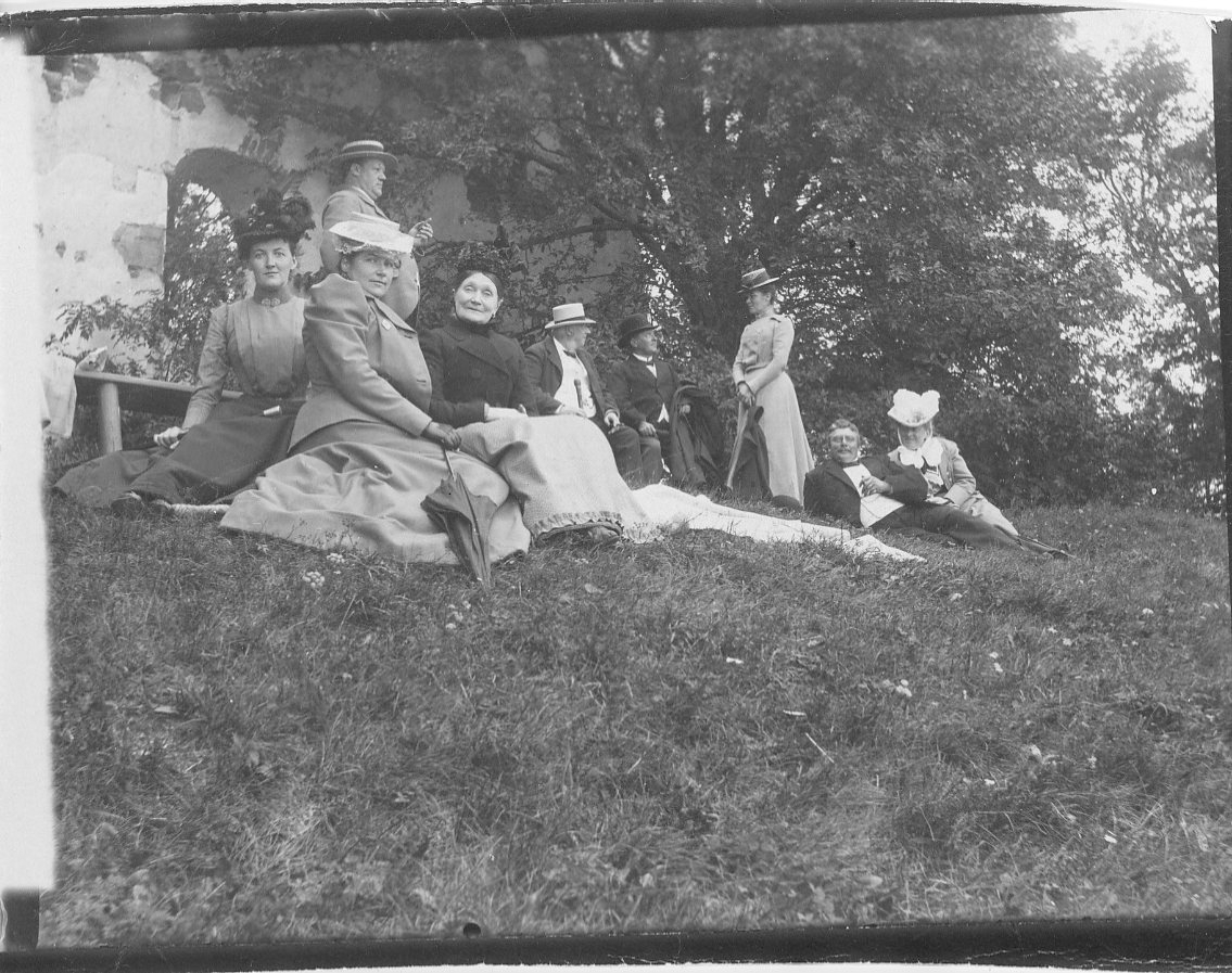 Ett sällskap med kvinnor och män sitter in grässlänt intill en ruin.