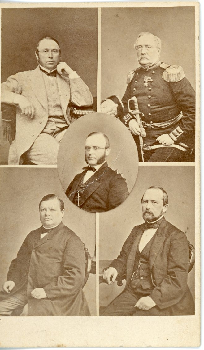Collage med porträtt av fem okända man sånär som på mannen högst upp till höger: N F Hjertström i militär uniform.