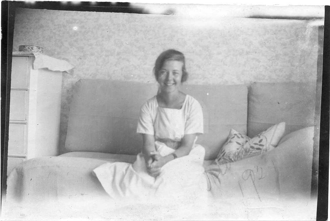 En flicka i övre tonåren sitter i en soffa och ler mot fotografen. Hon har ljus klänning på sig.