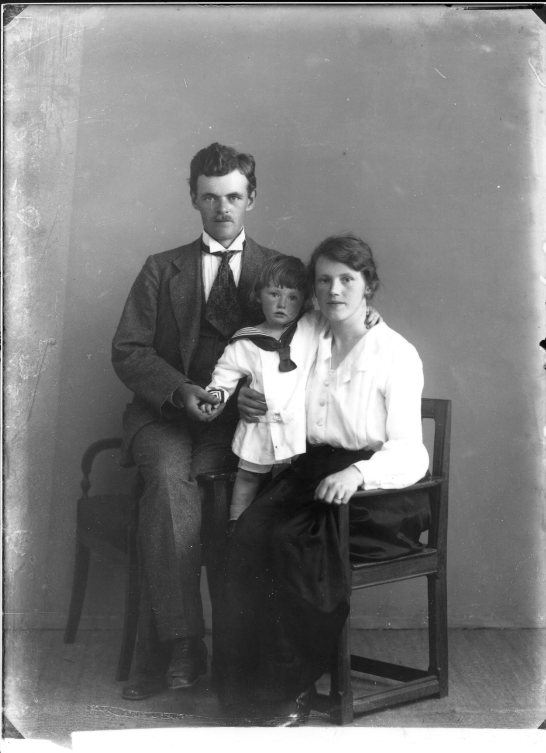 En man sitter på armstödet på en stol tätt intill en sittande kvinna, mellan dem en lite pojke i sjömanskostym.