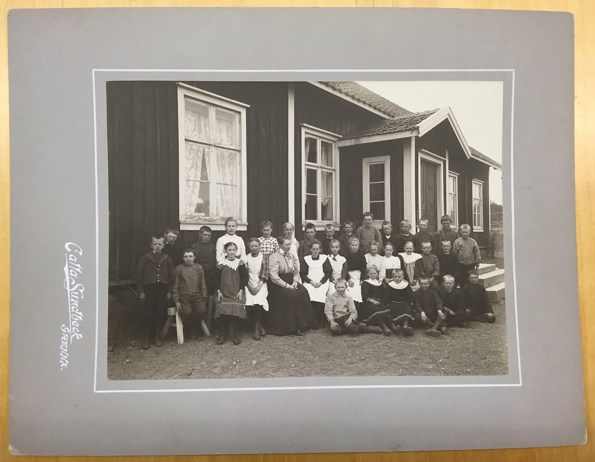 Folkskolelärarinnan Charlotta Kristina Johansson med skolbarn, sittande och stående framför Mörstorps skola.