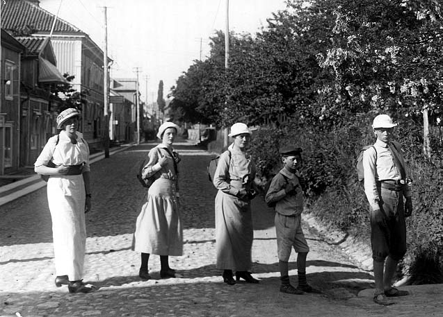Tre flickor/ung kvinna och två pojkar med ryggsäckar står på rad över den kullerstensbelagda Brahegatan i Gränna. Eftermiddagssol från väster.