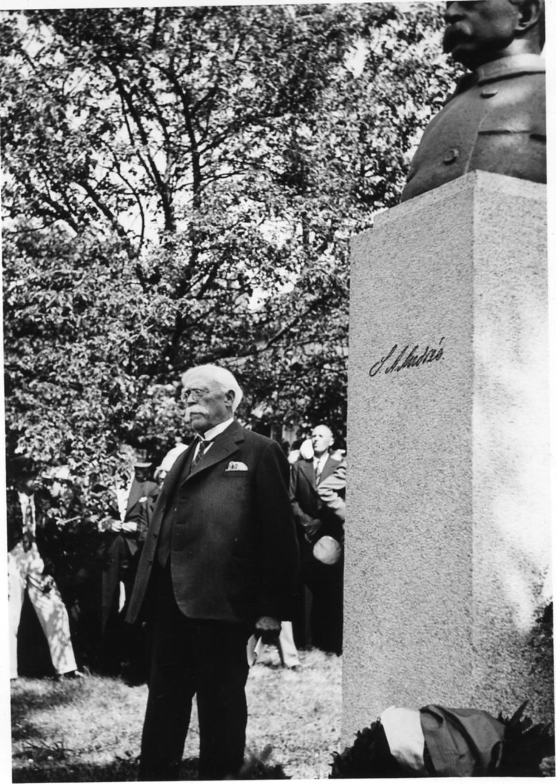 En man håller ett tal intill den Andréebyst som just har avtäckts och invigts på slänten framför framför Grenna Hembygdsgård/Andréemuseum). Mannen är Carl Setterberg, representant för Svenska Uppfinnarföreningen och bekant med S A Andrée.