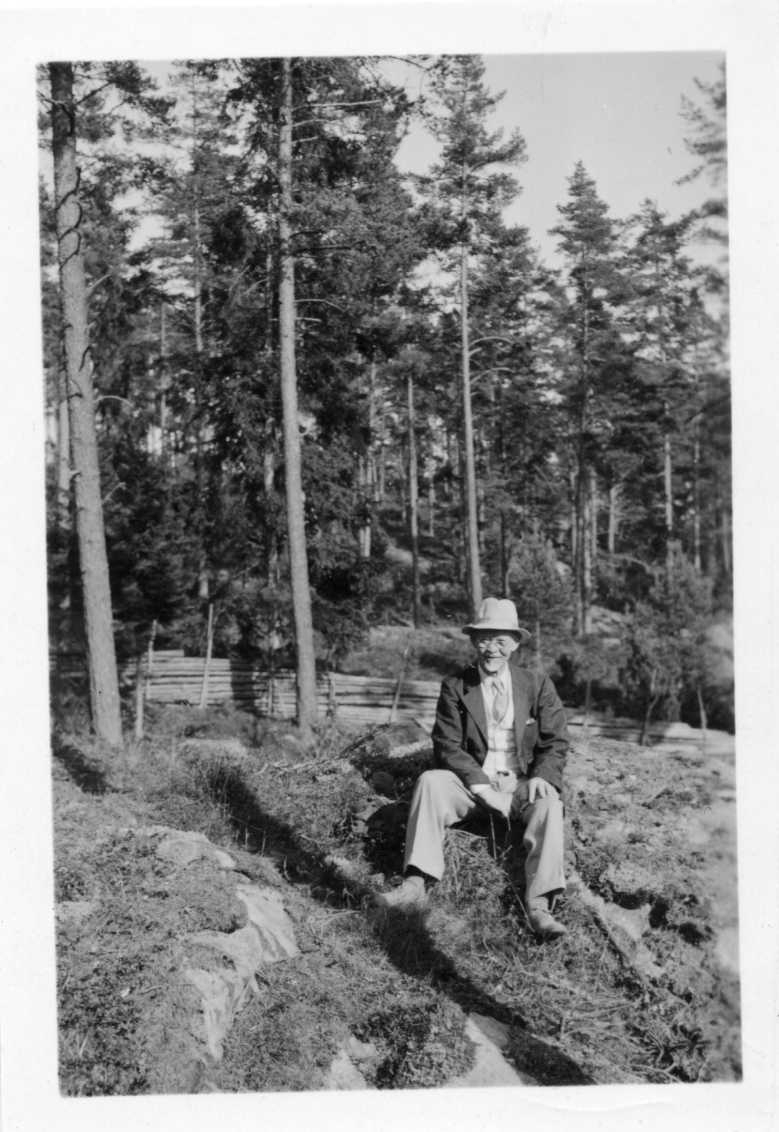 En man sitter på en liten bergknalle framför en gärdesgård och höga tallar.