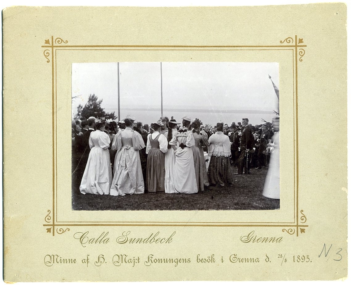 Kung Oscar II står på Grännaberget omgiven av Grännabor. Närmast i bild damer i långa ljusa klänningar och små hattar på huvudet.
