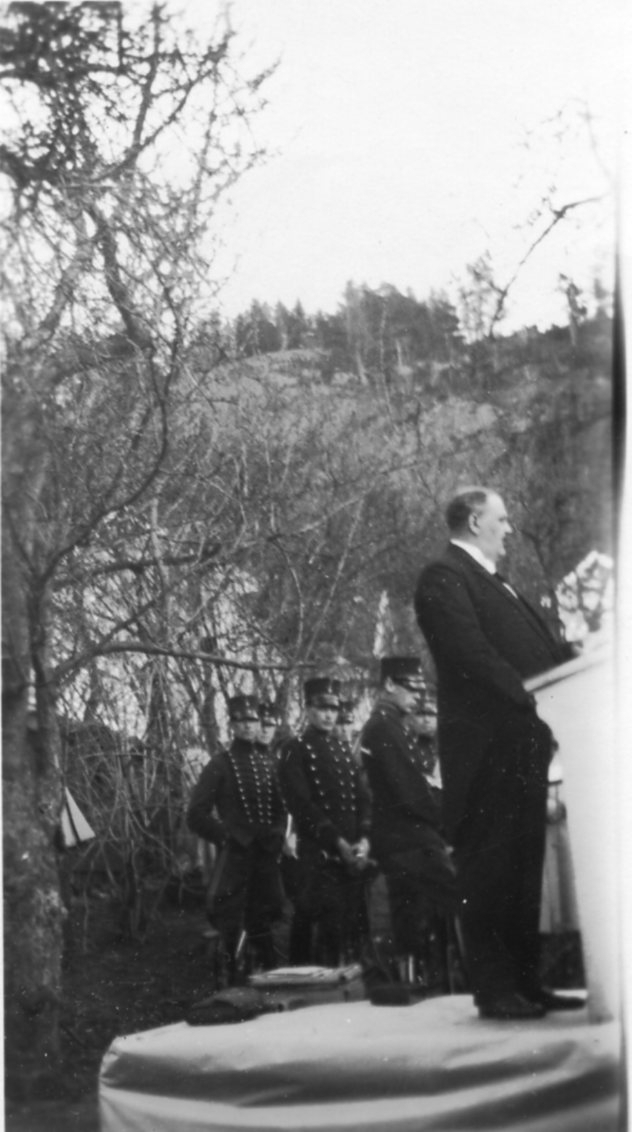 En man står i talarstol och talar, bakom honom en grupp militärer. Foto i samband med invigning av Andréemuseet i Francskska gården.