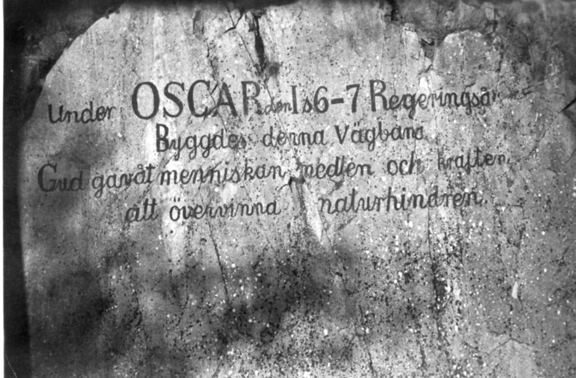 Minnestext om ett vägbygge huggen i bergvägg: "Under Oscar den Is 6-7 Regeringsår Byggdes denna Vägbana. Gud gav åt menniskan medlen och kraften att övervinna naturhindren.".