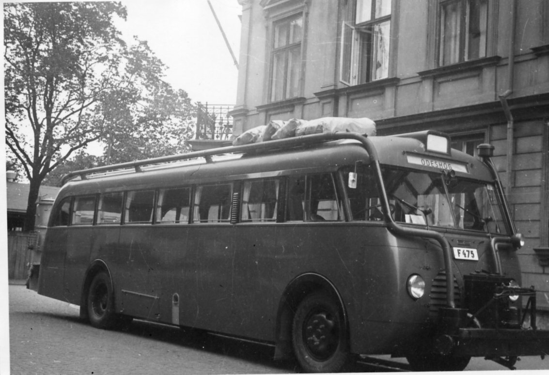 En buss står parkerad intill en större putsad byggnad. Bussen kör för JGÖ-trafiken (Jönköping-Gränna-Ödeshög) och har reg nr F475. På taket ligger en antal säckar och i fronten sitter möjligen ett gengasaggregat. Enligt skylten i fronten är destinationen Ödeshög.