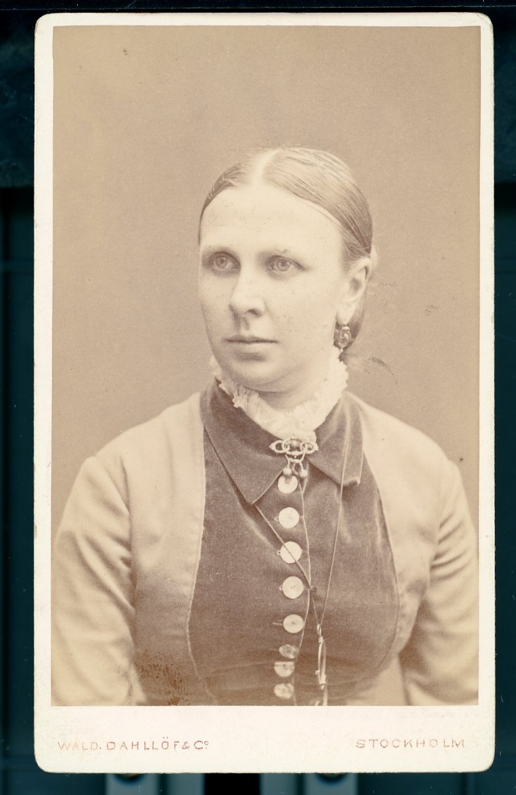 Kabinettsfotografi: bröstbild av Hanna Quennerstedt, brosch vid halsen och glasögon hängande i kedja runt halsen.