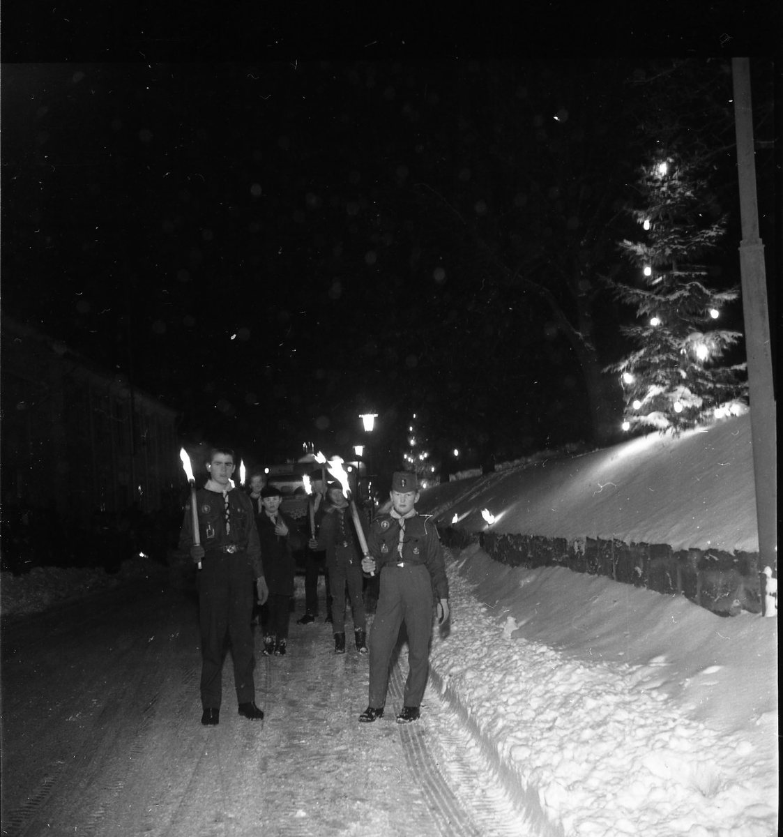 Fyra unga män går i en kortege längst Brahegatan. Bakom dem åker en lastbil. De håller fackor i händerna.