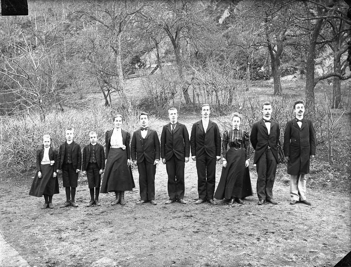 Gruppbild med 10 personer uppställda på led från liten till stor, av bägge könen. En syskongrupp?