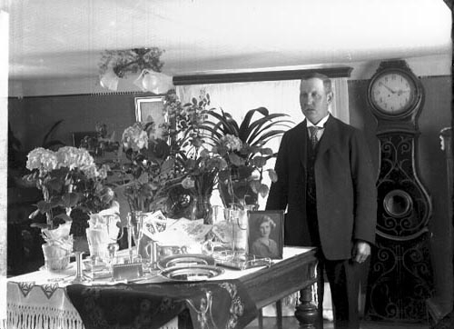 En äldre man står vid ett bord fullt med blomsteruppsättningar. Bland blommorna ett ramat fotografi av en ung kvinna. Ett golvur står mot väggen bakom mannen.