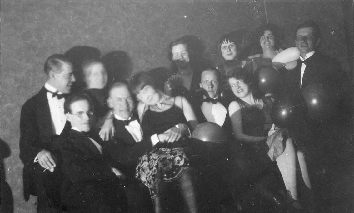 Elva högtidsklädda kvinnor och män i feststämning med ballonger.