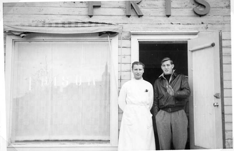 En ung man i skinnjacka står utanför en frisörsalong i Gränna tillsammans med frisören Ingvar Risberg.