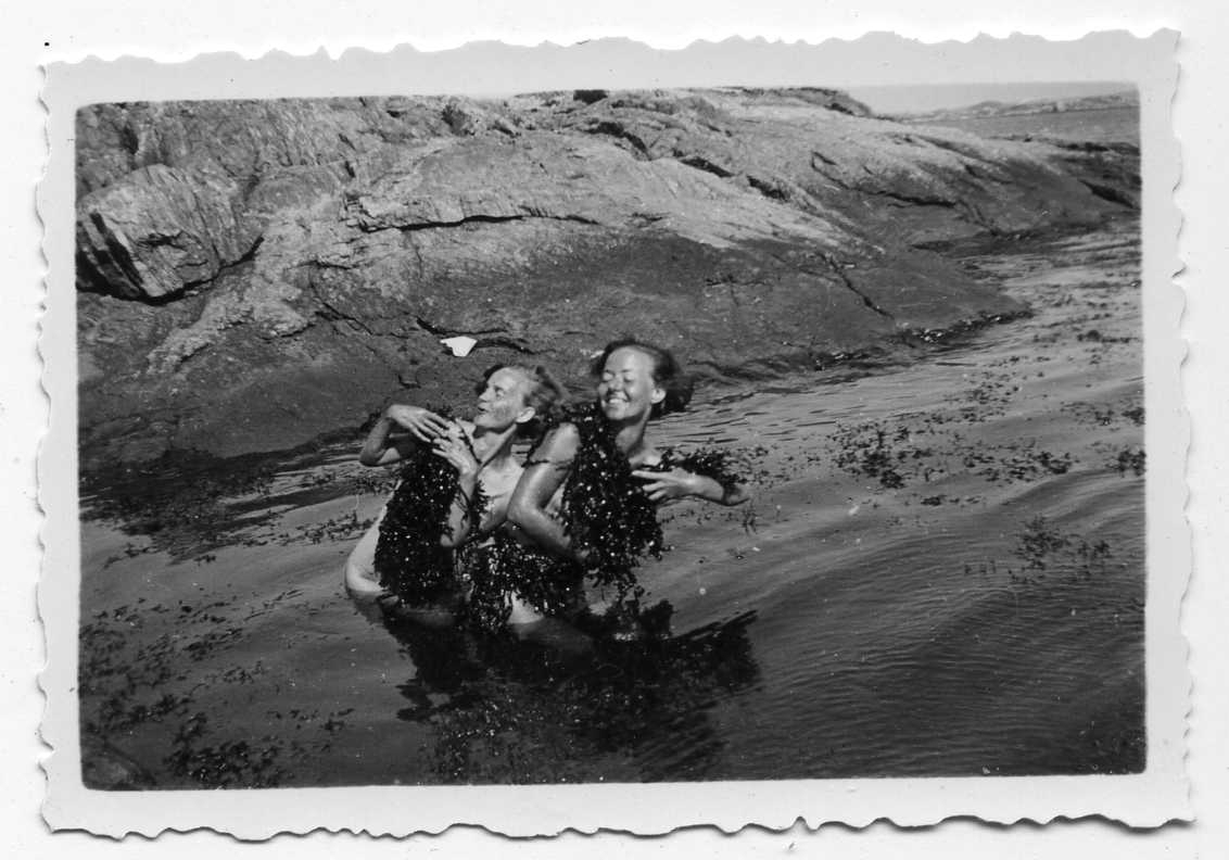 Två kvinnor nakenbadar vid en klippa, de är draperade i tång.