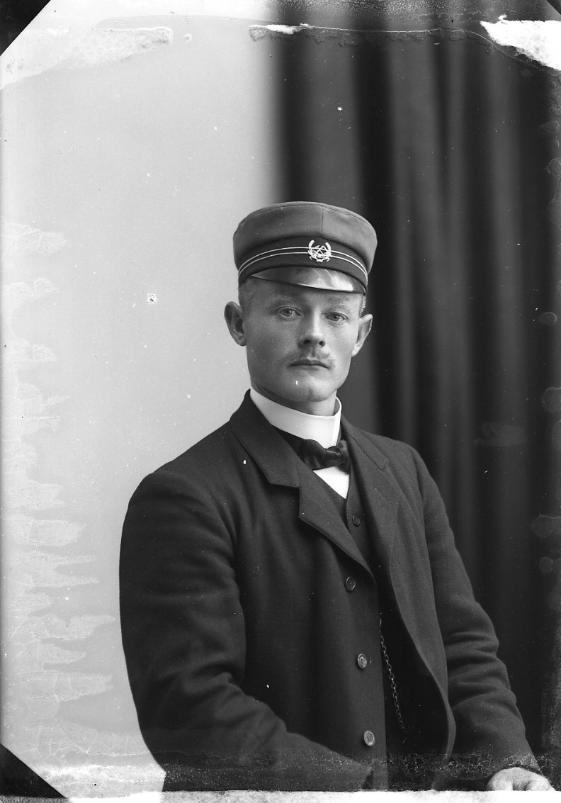 Bröstbild av en sittande ung man. Han bär en keps med okänt märke.