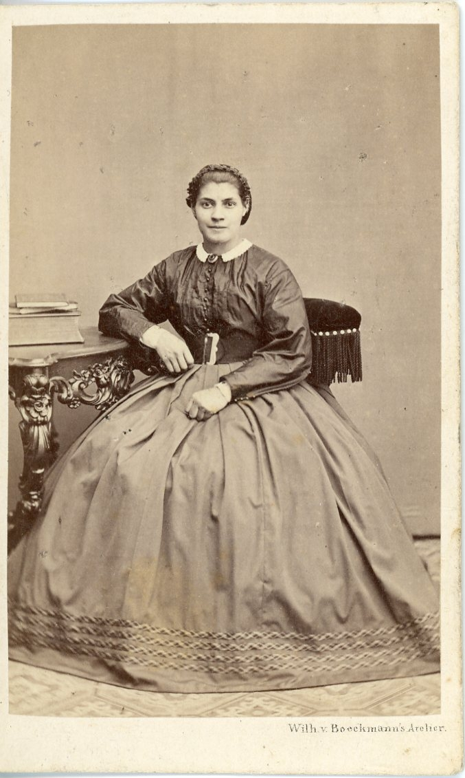 Porträtt av en okänd ung kvinna som sitter vid ett bord där det ligger böcker.