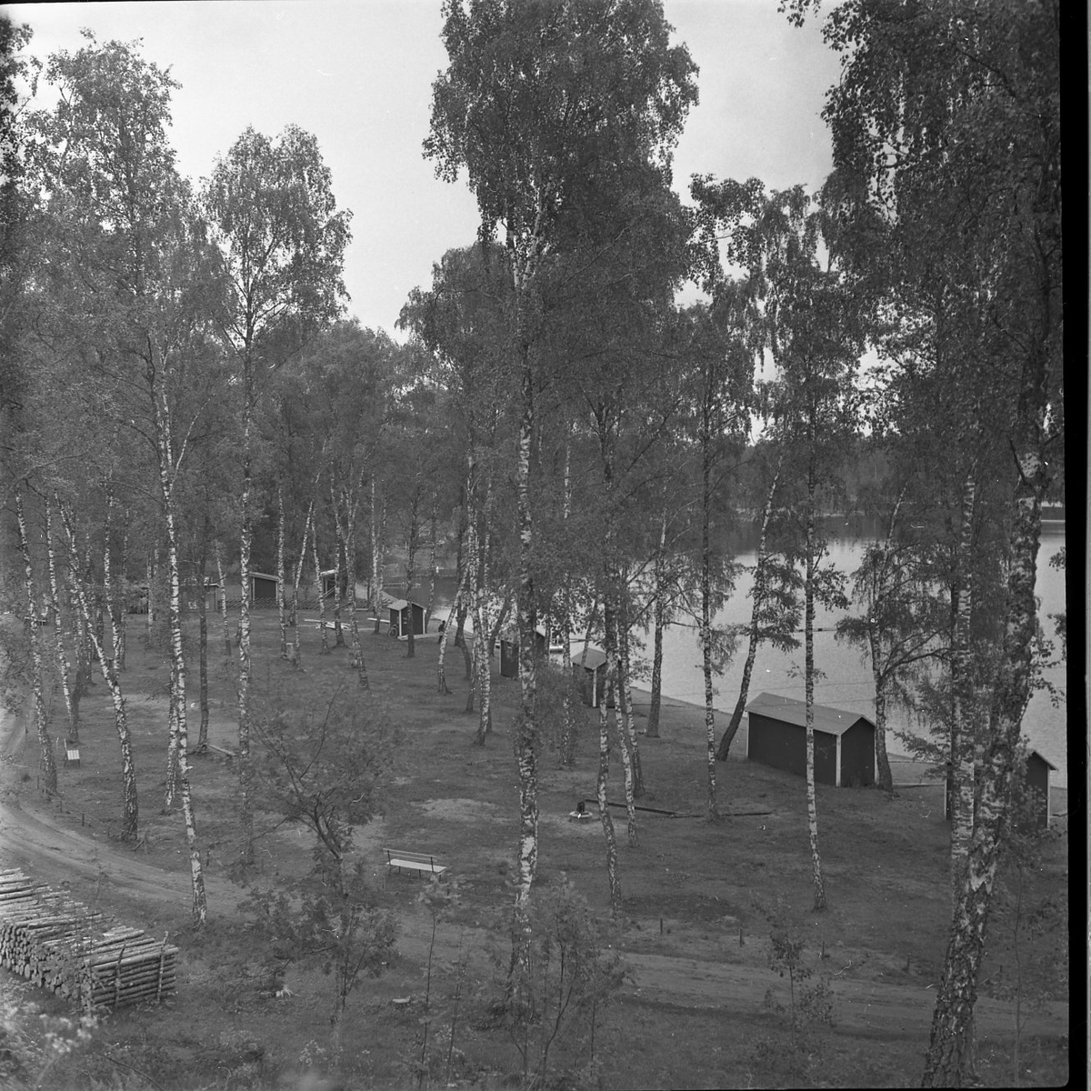 En sjö med björkar längst strandkanten. Små röda stugor står längst med sjön.