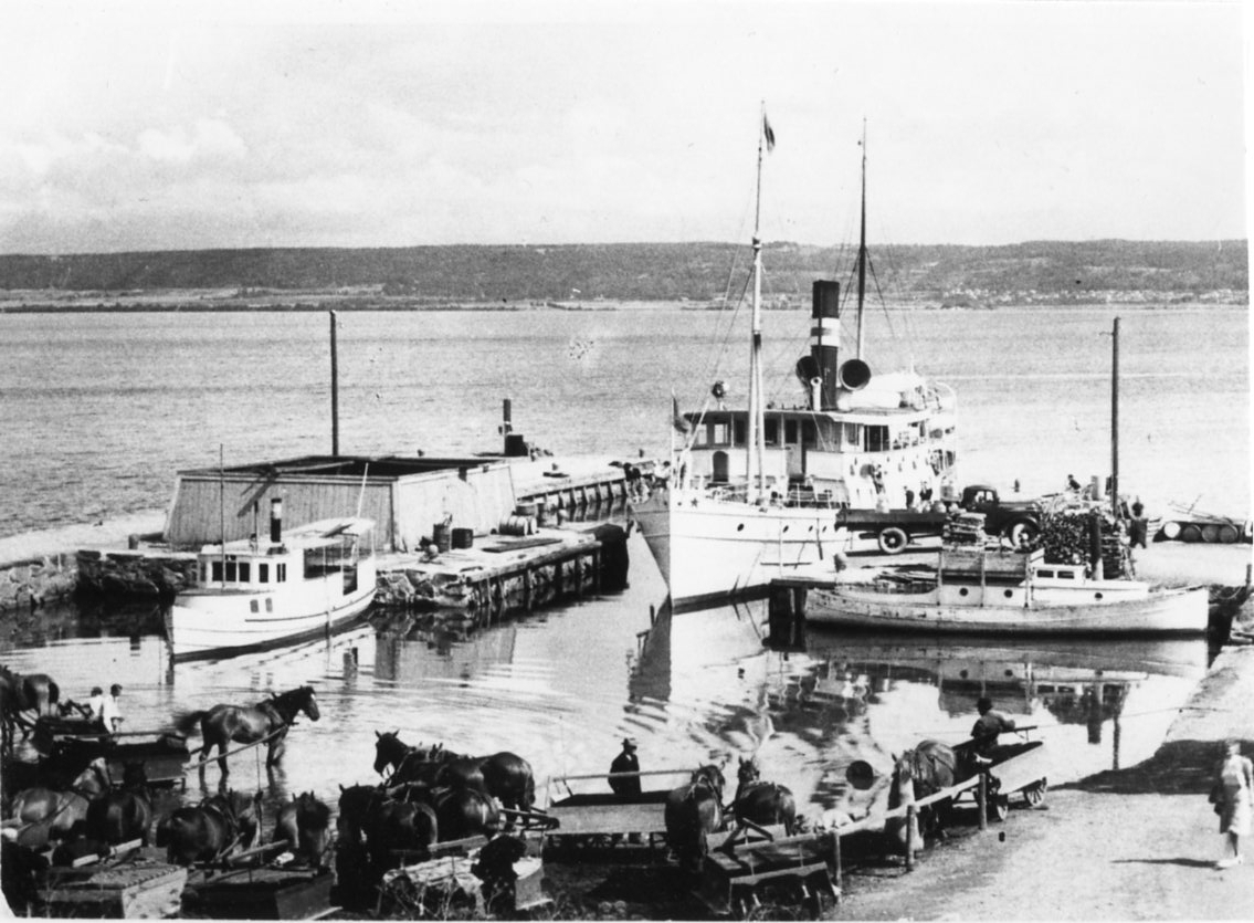 Visingsö hamn nedanför slottsruinen med båtarna Brahe och Bris. Motala Express är på väg att lägga till. En lastbil på kajen till höger. Ett flertal remmalag står vid stranden. Enstaka hästar står i vattnen och svalkar sig.