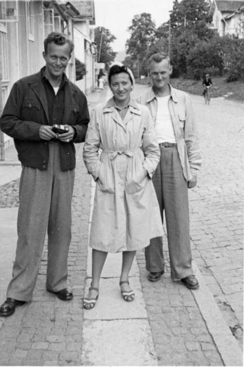 Två amerikanska bombflygare och en kvinna däremellan på trottoaren utanför Brahegatan 5 i Gränna. Mannen till vänster är Lester Mickelson. Kvinnan är möjligen en dansk judisk flykting vid namn Sonny. Hon var i Gränna med en syster.