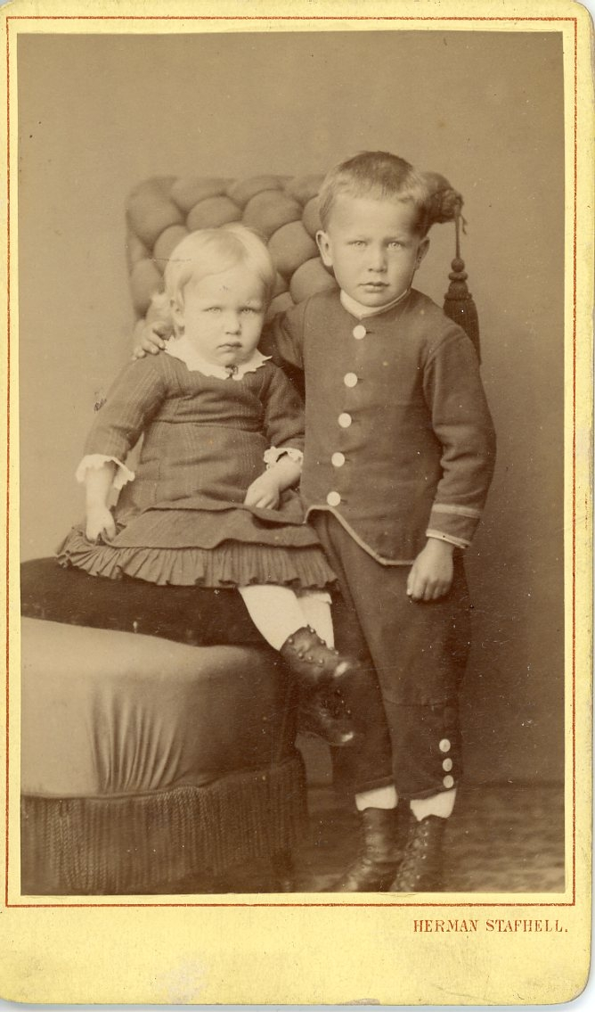 Porträtt av en okänd liten flicka och pojke. Pojken håller armen om flickan som sitter på en Emma. Troligen syskon.