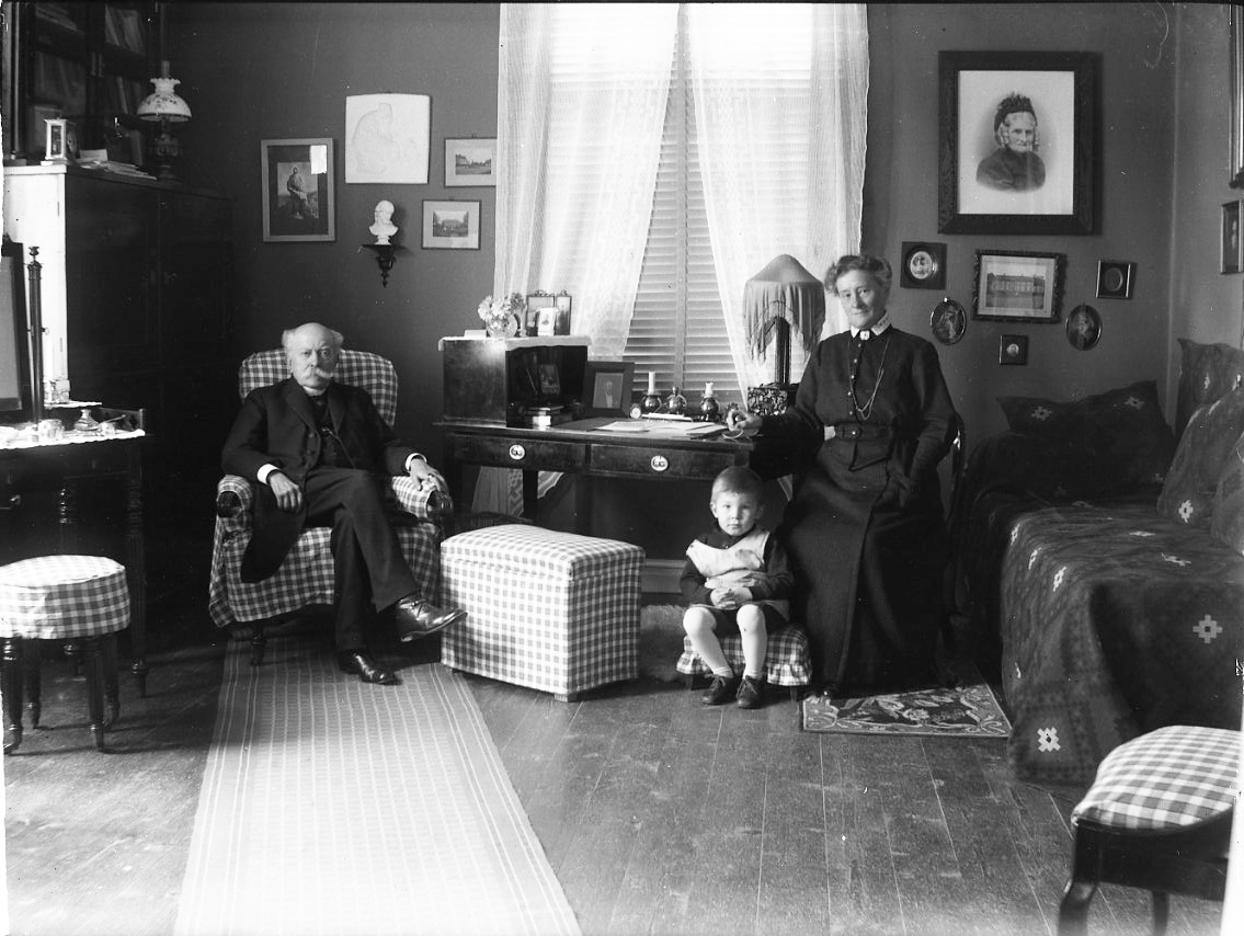 En man och en kvinna sitter på ömse sidor om ett skrivbord som står framför ett fönster. En liten pojke sitter på en fotpall framför kvinnan.
